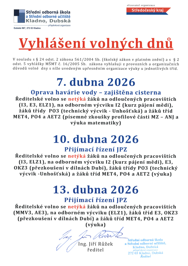 ředitel školy prostřednictvím přípravného výboru oprávněným osobám – zákonným zástupcům nezletilých žáků, nezletilým žákům, zletilým žákům školy a pedagogickým pracovníkům SOŠ a SOU, Kladno, Dubská termín volby členů školské rady při SOŠ a SOU, Kladno, Dubská.